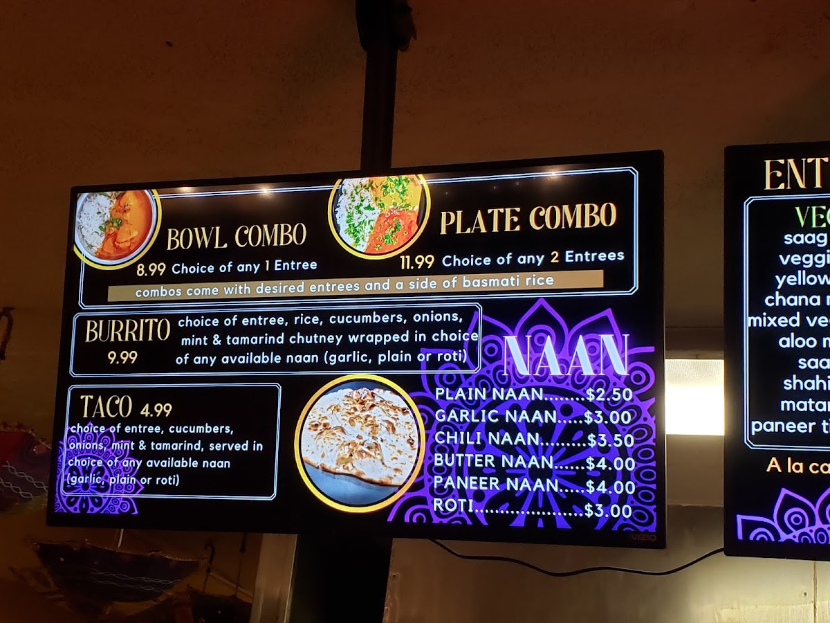 The menu features enticing combo options: choose from a delightful Bowl Combo with one entree and Basmati rice for just $13, or indulge in a Plate Combo with two entrees for $17. For those with a hearty appetite, the Bigger Plate offers a choice of three entrees alongside rice or naan, salad, and raita for $23.